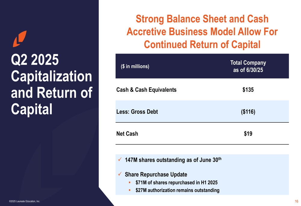 No primeiro semestre de 2025, a Laureate recomprou US$ 71 milhões em ações, com US$ 27 milhões restantes em sua autorização. A empresa tinha 147 milhões de ações em circulação em 30 de junho.