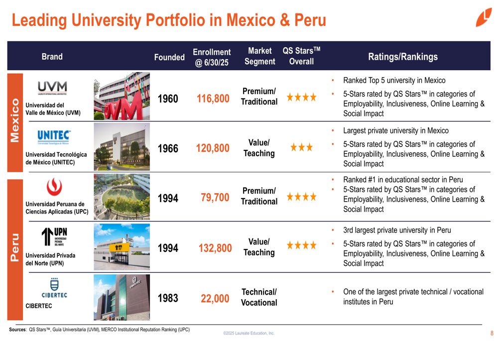 O portfólio da empresa inclui cinco grandes instituições educacionais no México e Peru, atendendo mais de 472.000 estudantes. Essas instituições receberam fortes classificações de qualidade, com várias conquistando 4 ou 5 Estrelas QS em categorias como empregabilidade, inclusão, aprendizado online e impacto social.