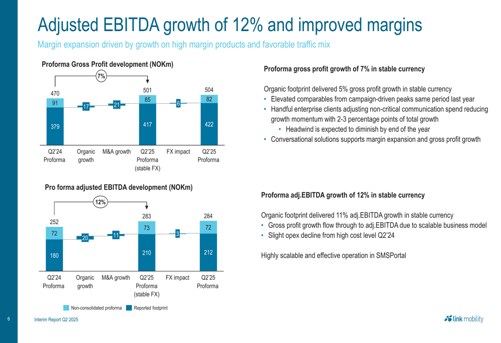 Os números proforma da Link, que incluem a aquisição da SMSPortal, mostraram lucro bruto de 501 milhões de NOK, representando um aumento de 7% em relação ao ano anterior, apesar dos comparativos elevados do ano anterior. O EBITDA ajustado proforma demonstrou crescimento robusto de 12% para 283 milhões de NOK, impulsionado pela aquisição da SMSPortal e pela tendência de crescimento sólido em produtos de margem mais alta.