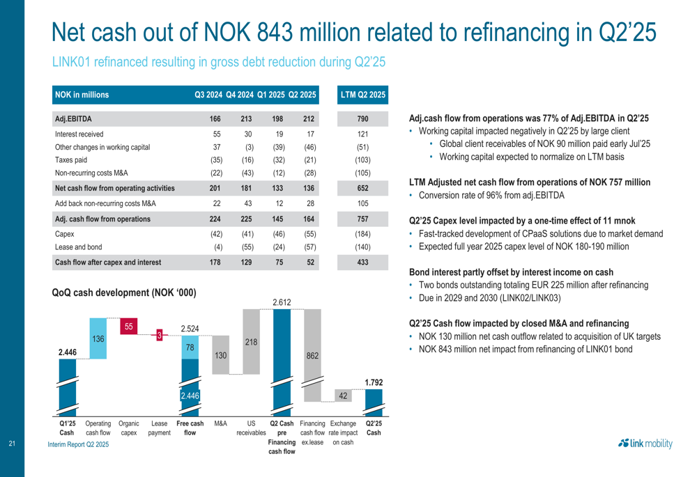 O fluxo de caixa ajustado da empresa proveniente das operações representou 77% do EBITDA ajustado no 2º tri de 2025, com o fluxo de caixa líquido ajustado LTM das operações atingindo 757 milhões de NOK. O gráfico a seguir ilustra o desenvolvimento do fluxo de caixa da empresa: