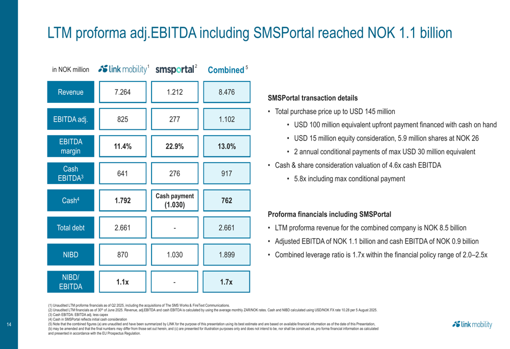 Em base proforma, incluindo a SMSPortal, os números LTM da Link mostram receita combinada de 8.476 milhões de NOK e EBITDA ajustado combinado de 1.102 milhões de NOK, demonstrando o significativo aumento de escala proporcionado pela aquisição: