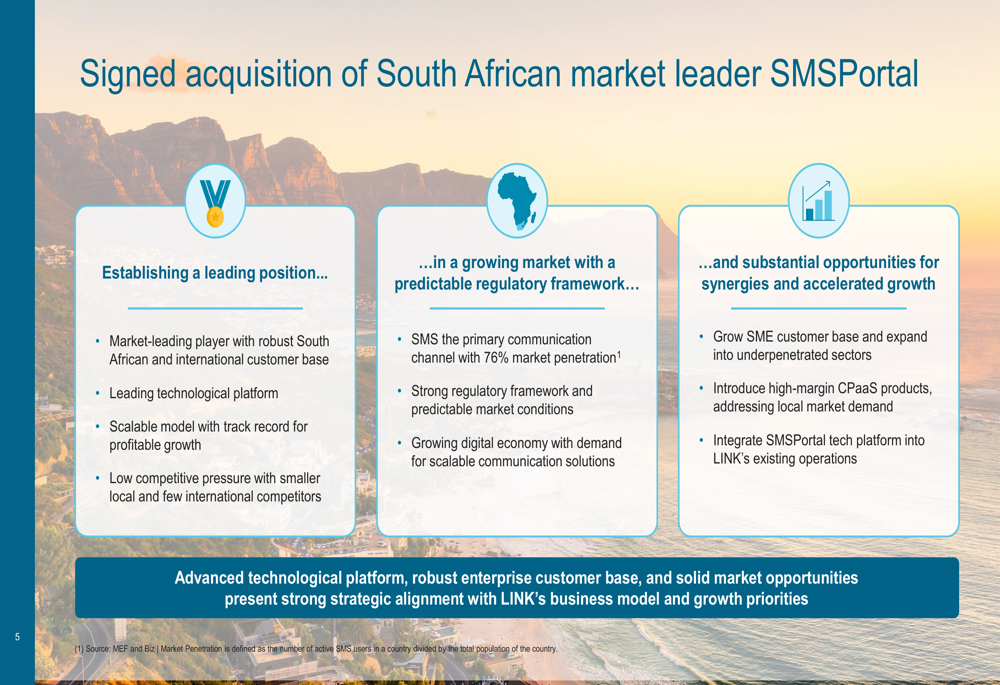 A aquisição da SMSPortal representa um marco significativo na estratégia de expansão da Link Mobility. Como líder de mercado na África do Sul, a SMSPortal proporciona à Link uma posição forte em um mercado robusto com 76% de penetração e oportunidades substanciais para sinergias e crescimento acelerado. A aquisição foi avaliada em um atrativo múltiplo de 4,6x EBITDA em caixa, mais um pagamento condicional de no máximo US$ 30 milhões.