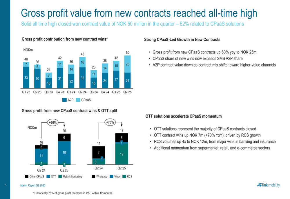 Além da expansão geográfica, a Link continua focada em soluções CPaaS de alta margem, com novas conquistas de contratos CPaaS acelerando para 50 milhões de NOK. O valor do lucro bruto de novos contratos atingiu um recorde histórico no 2º tri, com soluções CPaaS representando aproximadamente 52% das novas conquistas - agora excedendo a participação tradicional de SMS A2P.