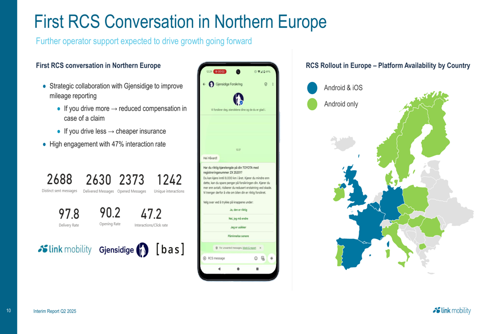 A empresa também destacou sua inovação em Serviços de Comunicação Rica (RCS), apresentando a primeira conversa RCS no Norte da Europa através de uma colaboração com a Gjensidige para relatórios de quilometragem. Esta implementação alcançou métricas de engajamento impressionantes, incluindo uma taxa de interação de 47,2% e taxa de abertura de 90,2%.