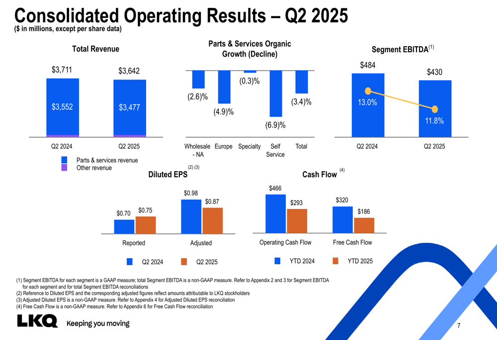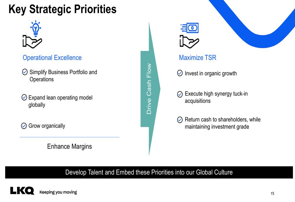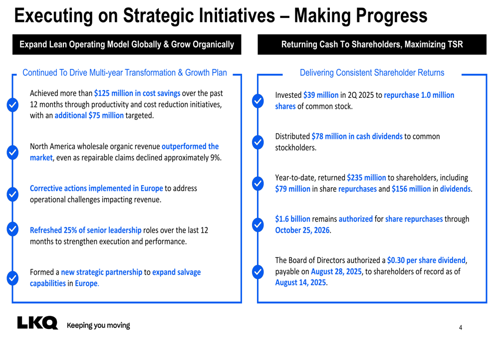 A administração também renovou 25% dos cargos de liderança sênior para fortalecer a execução e o desempenho. Além disso, a LKQ formou uma nova parceria estratégica para expandir as capacidades de salvados na Europa, abordando um de seus mercados mais desafiadores.