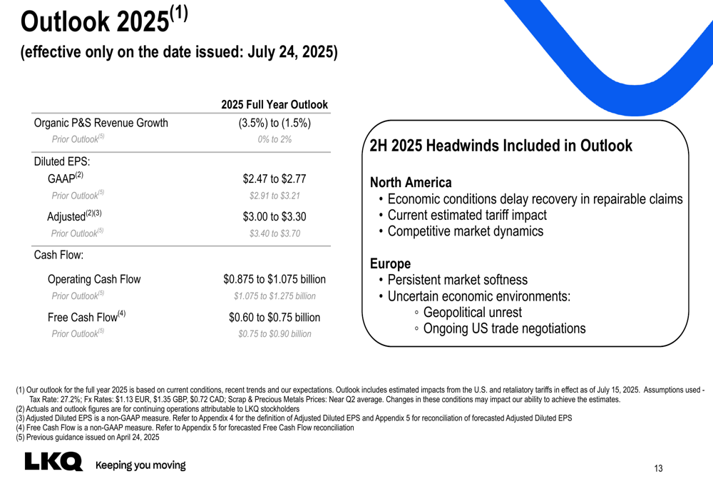Com base nas condições atuais de mercado, a LKQ revisou suas perspectivas para o ano fiscal de 2025: