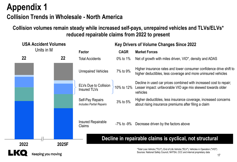 Embora o volume total de acidentes permaneça estável em aproximadamente 22 milhões, a composição mudou significativamente. Os sinistros reparáveis segurados diminuíram a uma CAGR de -7% a -9% desde 2022, impulsionados por aumentos em veículos não reparados, perdas totais e reparos pagos pelo próprio consumidor. A LKQ atribui essas mudanças a taxas de seguro mais altas, menor confiança do consumidor, queda nos preços de carros usados e aumento nos custos de reparo.