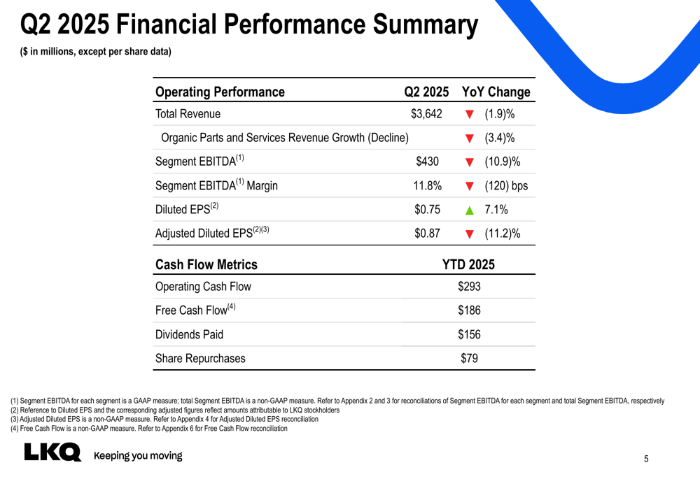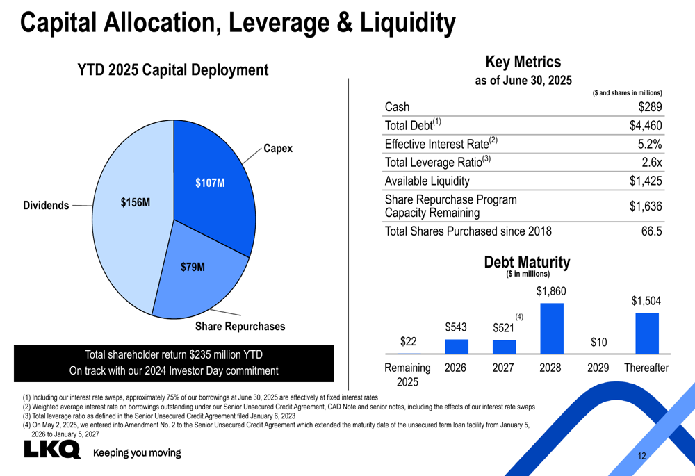 No acumulado do ano, a LKQ retornou US$ 235 milhões aos acionistas, incluindo US$ 79 milhões em recompras de ações e US$ 156 milhões em dividendos. O Conselho de Administração autorizou um dividendo de US$ 0,30 por ação, pagável em 28 de agosto de 2025.