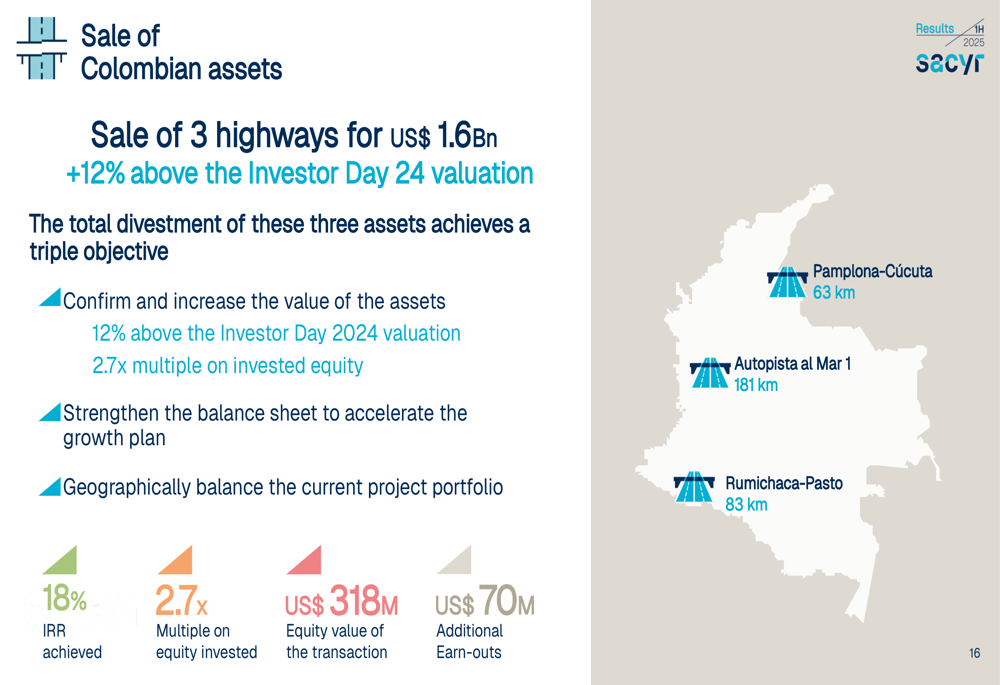 Um elemento central da estratégia da Sacyr tem sido a otimização de seu portfólio de ativos, destacada pela venda de três ativos rodoviários na Colômbia por US$ 1,6 bilhão, 12% acima da avaliação apresentada no Investor Day da empresa em 2024. Esta transação alcançou múltiplos objetivos estratégicos: