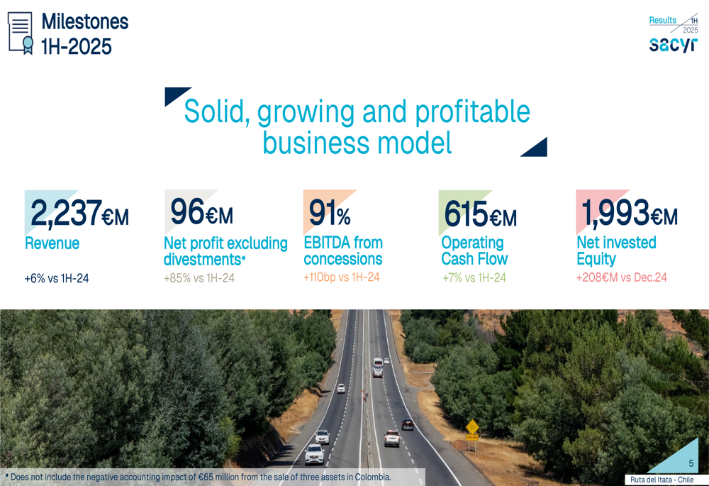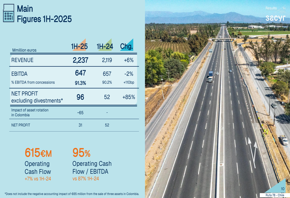 A empresa mantém o foco em suas prioridades estratégicas: crescer seu negócio de concessões, manter uma baixa relação de dívida com recurso e proporcionar retornos atrativos aos acionistas. Para 2025, a Sacyr já pagou seu primeiro dividendo em dinheiro de 4,5 centavos por ação em julho, cumprindo compromissos assumidos em seu Plano Estratégico.