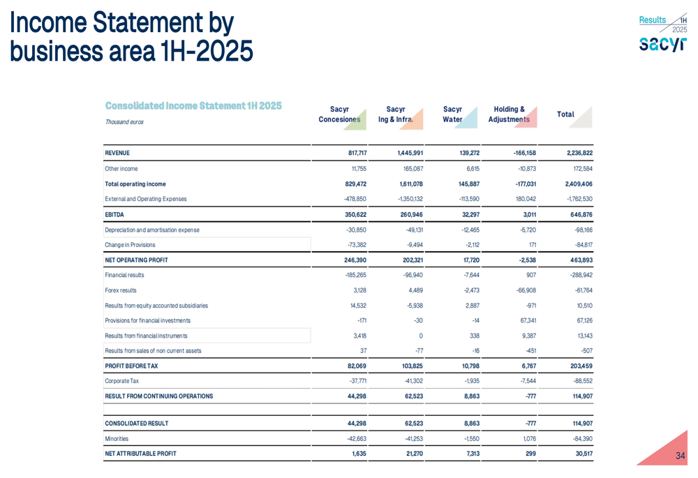 Por segmento de negócios, a Sacyr Concesiones gerou receita de €818 milhões com margem EBITDA de 61,3%. A divisão de Engenharia e Infraestrutura viu um aumento de 18% na receita para €1.446 milhões, com EBITDA crescendo 34% para €261 milhões. A divisão de Água demonstrou desempenho particularmente forte com receita aumentando 20% para €139 milhões e EBITDA crescendo 36% para €32 milhões.