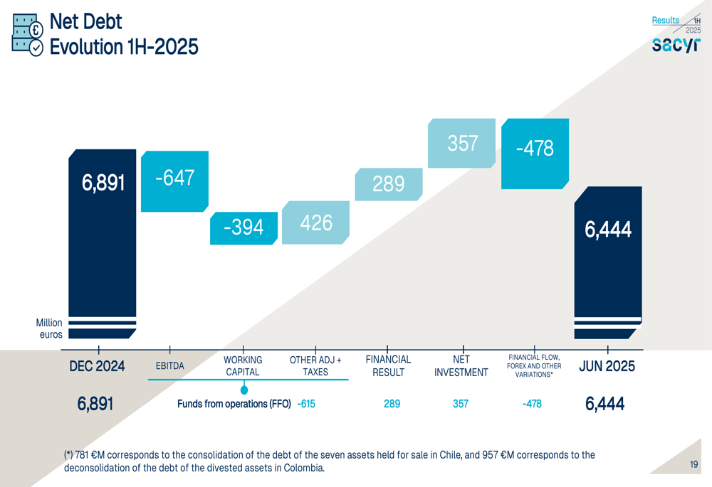 A empresa fez progressos significativos na redução de sua dívida líquida, que diminuiu de €6.891 milhões em dezembro de 2024 para €6.444 milhões em junho de 2025. Esta redução foi alcançada apesar do aumento do investimento para crescimento, com o capital investido em projetos de concessão aumentando €208 milhões para €1.993 milhões.