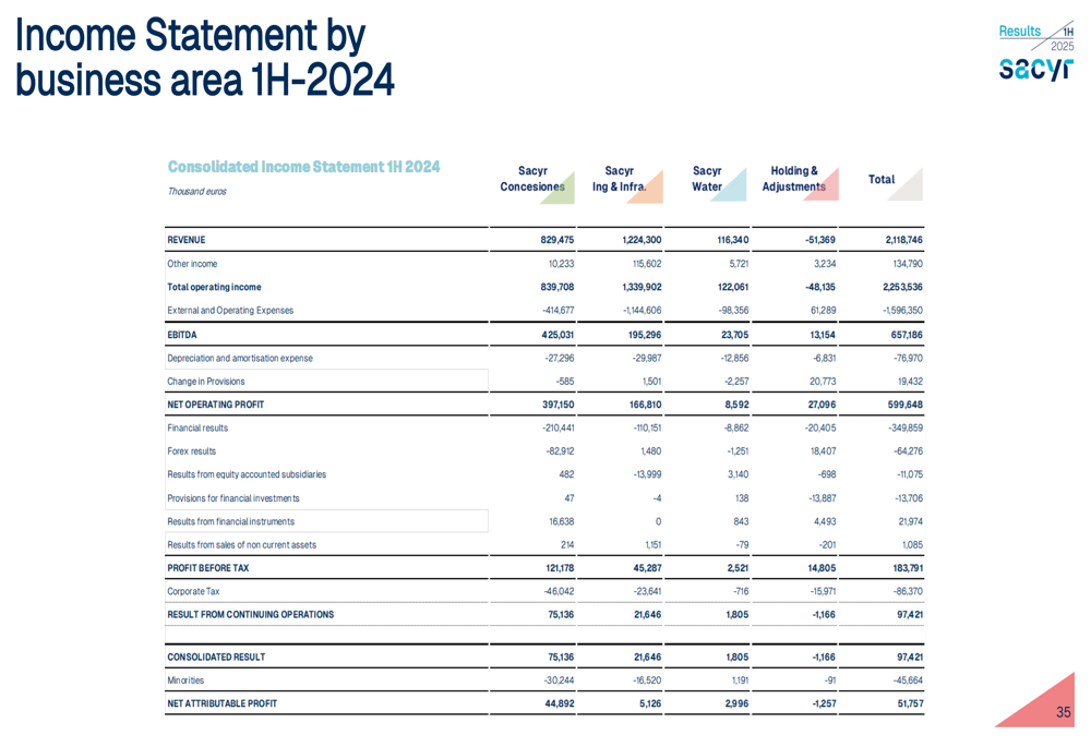 Com uma forte carteira de €10,8 bilhões em Engenharia e Infraestrutura (aumento de 2%) e €7,4 bilhões em Água (aumento de 54%), a Sacyr está bem posicionada para continuar sua trajetória de crescimento enquanto mantém seu foco em modelos de negócios baseados em concessões que geram fluxos de caixa estáveis e de longo prazo.