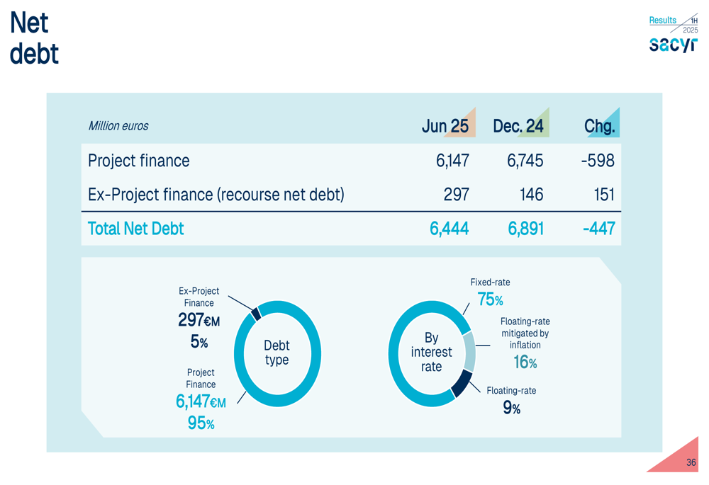 A Sacyr também otimizou sua estrutura de dívida emitindo um novo título de €500 milhões com vencimento de 5 anos e cupom de 4,75%. Esta transação reduziu o custo de títulos anteriores com vencimento em 2026 e 2027 (que tinham cupons de 6,3% e 5,8%, respectivamente) e teve um impacto positivo de €26 milhões na demonstração de resultados. A empresa também recebeu uma classificação de grau de investimento (BBB- com perspectiva estável) da EthiFinance.