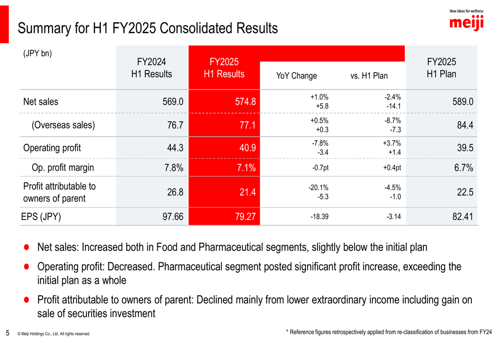 A Meiji Holdings reportou lucro operacional consolidado de 40,9 bilhões de ienes para o 1º semestre do ano fiscal de 2025, superando seu plano em 3,7% apesar de uma queda de 7,8% em relação ao ano anterior. As vendas líquidas atingiram 574,8 bilhões de ienes, ficando 2,4% abaixo da meta da empresa, mas mostrando um modesto aumento de 1,0% em comparação com o ano anterior.