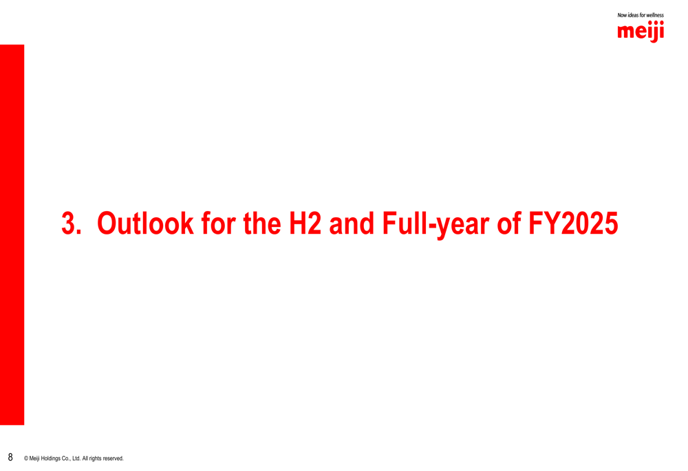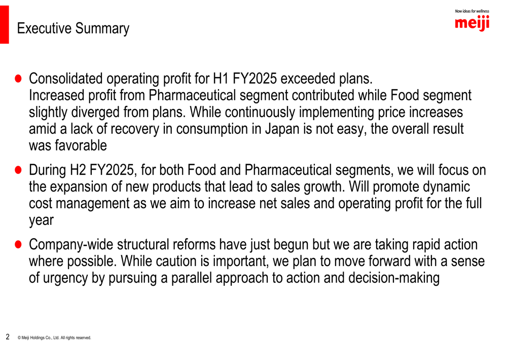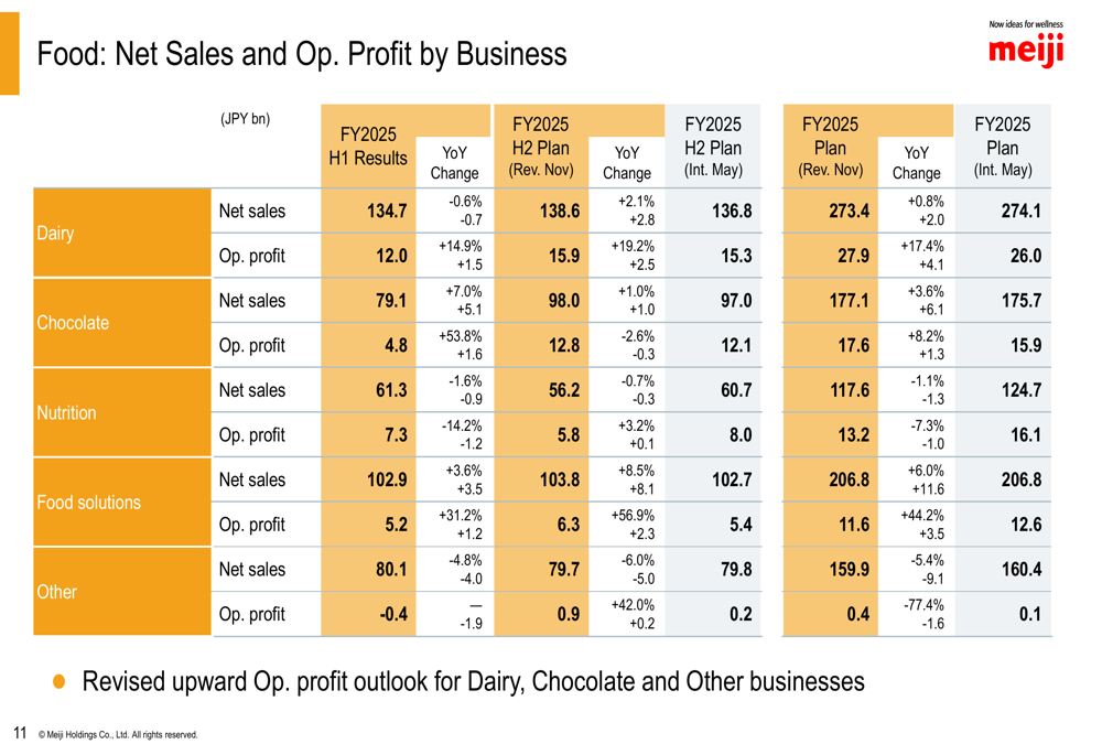 Para o segmento de Alimentos, a Meiji visa alcançar seu plano original de lucro operacional de 71,0 bilhões de ienes, apesar dos desafios enfrentados no primeiro semestre. A empresa planeja fortalecer sua estratégia de produtos e marketing, particularmente para produtos Lácteos e de Chocolate, que mantiveram um impulso positivo no 1º semestre. Para o negócio de Nutrição, a Meiji irá "promover vigorosamente os produtos principais" no 2º semestre.
