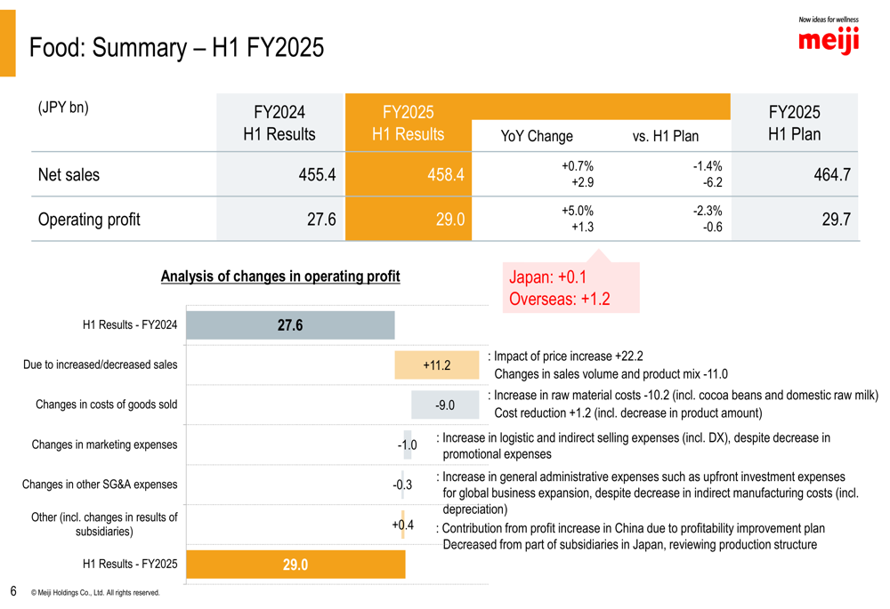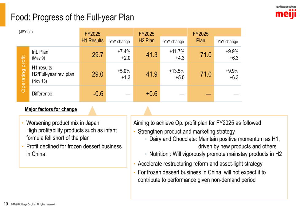 O aumento nas vendas contribuiu positivamente para o lucro operacional (+11,2 bilhões de ienes), mas isso foi em grande parte compensado por custos mais altos de mercadorias vendidas (-9,0 bilhões de ienes) e aumento nas despesas de marketing (-1,0 bilhão de ienes). A empresa observou que produtos de alta lucratividade, como fórmula infantil, ficaram abaixo do plano, enquanto o negócio de sobremesas congeladas na China teve desempenho inferior às expectativas.