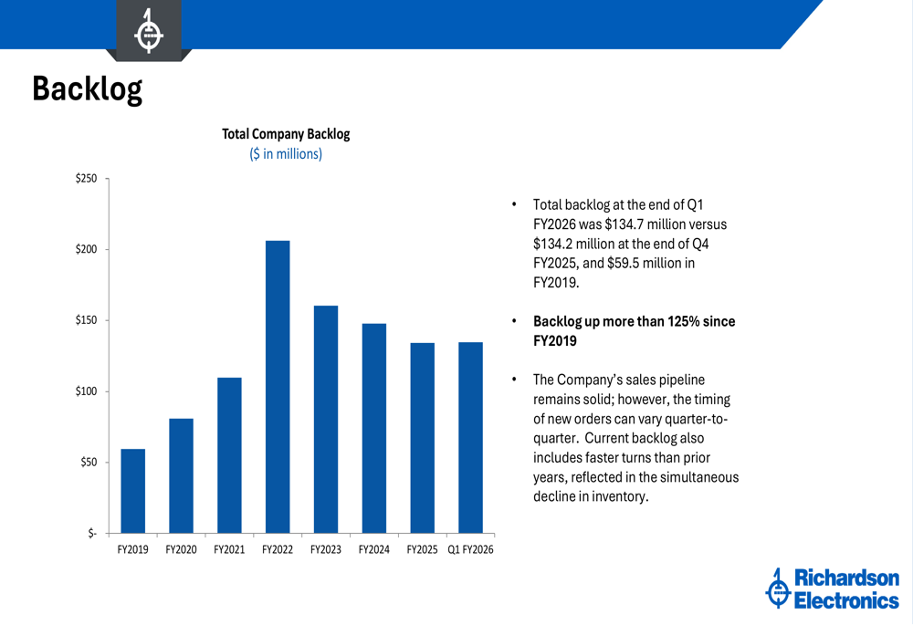 A Richardson Electronics reportou vendas líquidas consolidadas de US$ 54,6 milhões para o 1º tri do ano fiscal de 2026, representando um aumento de 1,6% em comparação ao mesmo período do ano anterior. Mais notavelmente, excluindo o negócio de Saúde que foi vendido, as vendas cresceram 6,8% ano a ano, marcando o quinto trimestre consecutivo de crescimento anual de vendas.