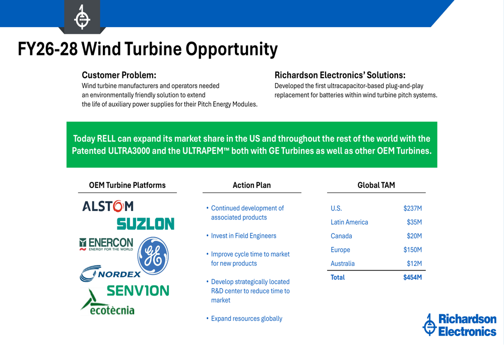 Um foco estratégico chave é o mercado de turbinas eólicas, onde a Richardson Electronics desenvolveu o patenteado ULTRA3000, uma substituição plug-and-play baseada em ultracapacitores para baterias dentro de sistemas de controle de passo de turbinas eólicas. Esta solução ambientalmente amigável estende a vida útil das fontes de alimentação auxiliares para Módulos de Energia de Passo.
