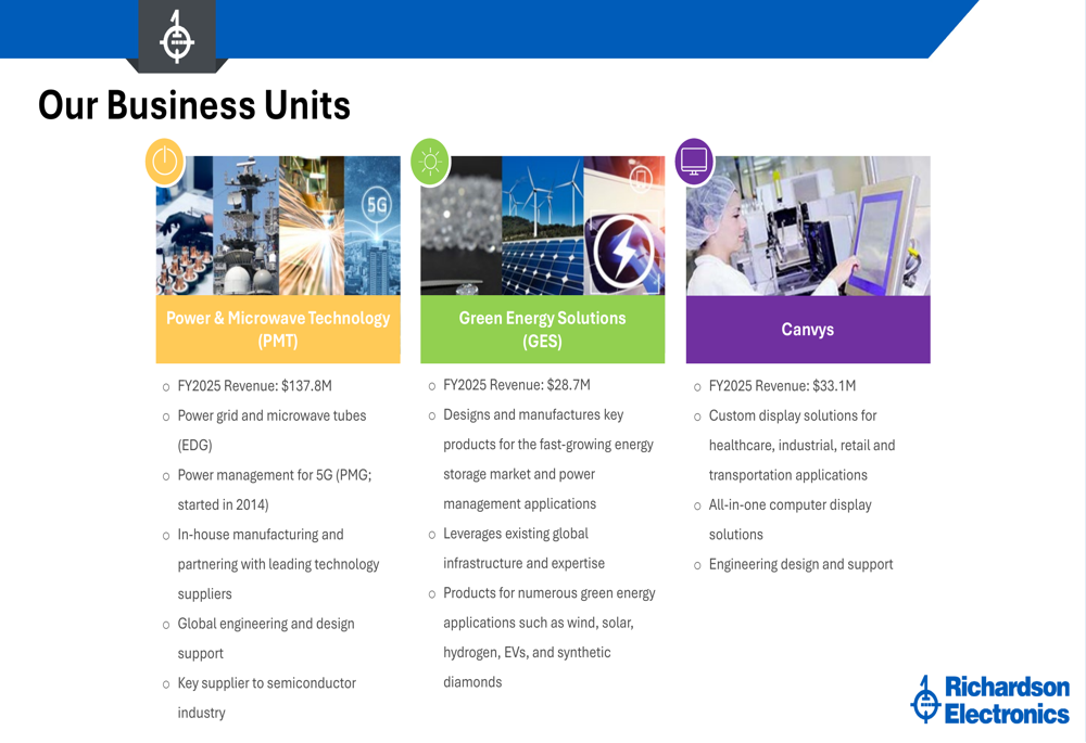 A Richardson Electronics opera através de três segmentos de negócios: Tecnologia de Energia e Microondas (PMT) com receita de US$ 137,8 milhões no ano fiscal de 2025, Soluções de Energia Verde (GES) com US$ 28,7 milhões, e Canvys com US$ 33,1 milhões. A estratégia de crescimento da empresa está centrada em aproveitar suas capacidades de engenharia e fabricação para desenvolver soluções de maior valor.