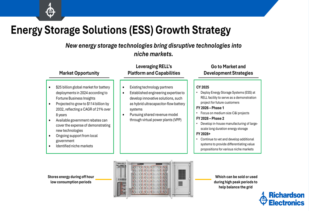 A Richardson Electronics também está expandindo para o mercado de Soluções de Armazenamento de Energia (ESS), que está projetado para crescer de US$ 25 bilhões em 2024 para US$ 114 bilhões até 2032. A abordagem em fases da empresa aproveita parcerias tecnológicas existentes e expertise de engenharia para capturar esta oportunidade crescente: