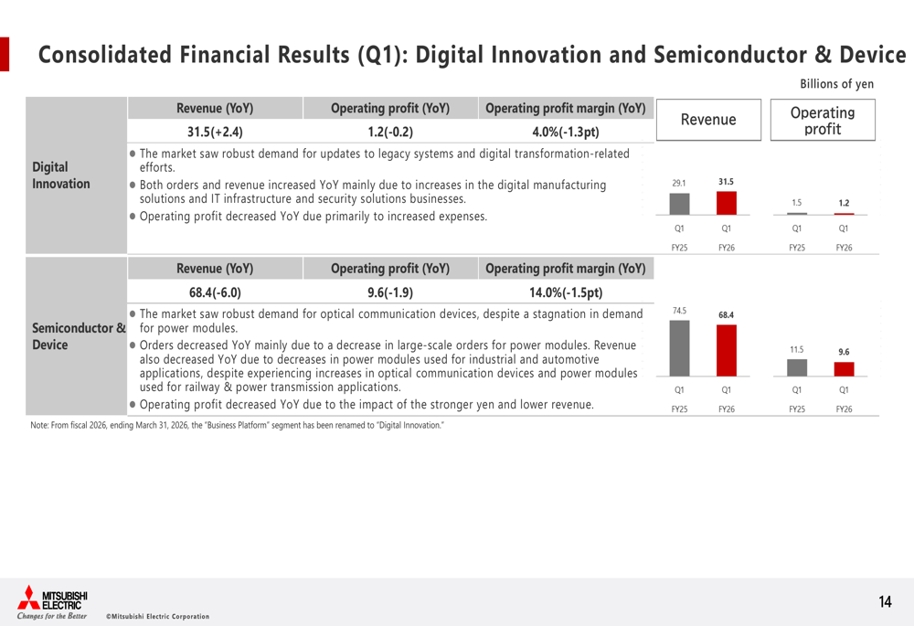 A Mitsubishi Electric continua focada em fortalecer sua estrutura de gestão através de melhorias de preços, reduções de custos e otimização de custos indiretos para navegar no desafiador ambiente econômico global enquanto capitaliza oportunidades de crescimento em segmentos-chave.