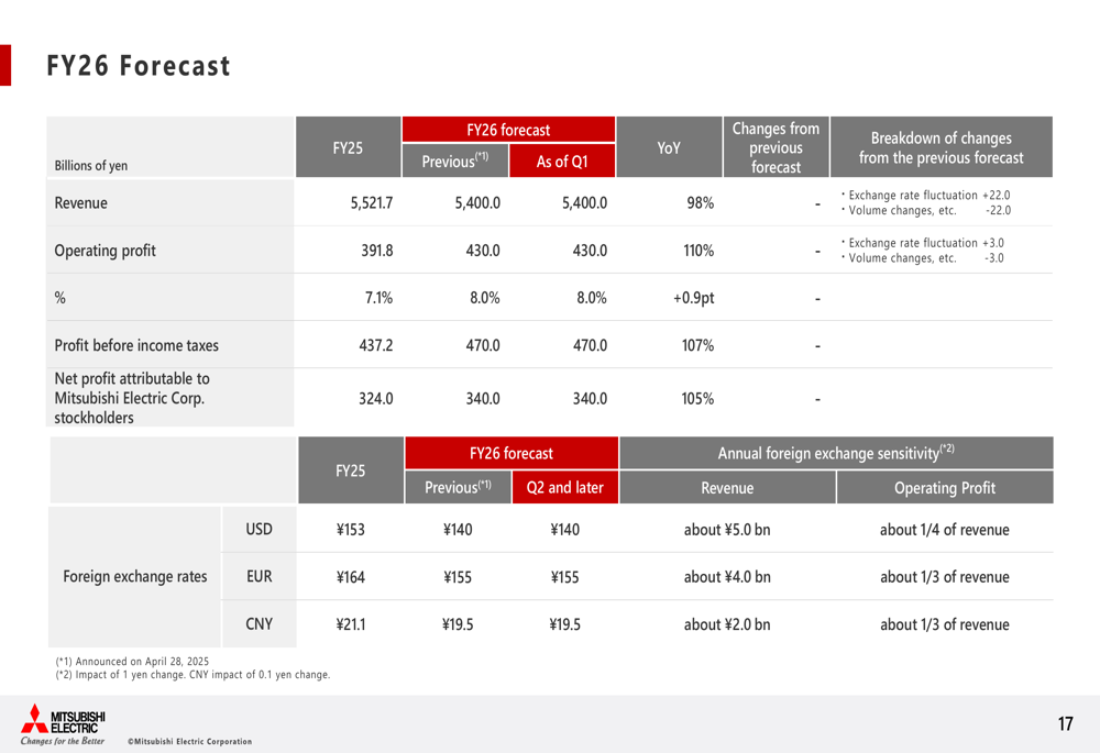 A empresa espera que o impacto das políticas tarifárias dos EUA permaneça em aproximadamente ¥30,0 bilhões. Embora as previsões de volume de vendas para o negócio de equipamentos automotivos tenham sido revisadas para baixo, espera-se que isso seja compensado pelo iene mais fraco e pelo aumento da demanda por produtos relacionados à IA no negócio de sistemas de automação industrial.