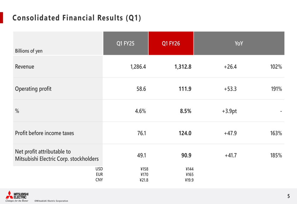 A Mitsubishi Electric reportou uma receita de ¥1.312,8 bilhões no 1º tri do ano fiscal 2026, representando um aumento de 2% em relação ao ano anterior. Mais impressionante, o lucro operacional disparou 91% para ¥111,9 bilhões, enquanto o lucro líquido atribuível aos acionistas da Mitsubishi Electric saltou 85% para ¥90,9 bilhões. A margem de lucro operacional melhorou significativamente para 8,5%, um aumento de 3,9 pontos percentuais em relação ao ano anterior.