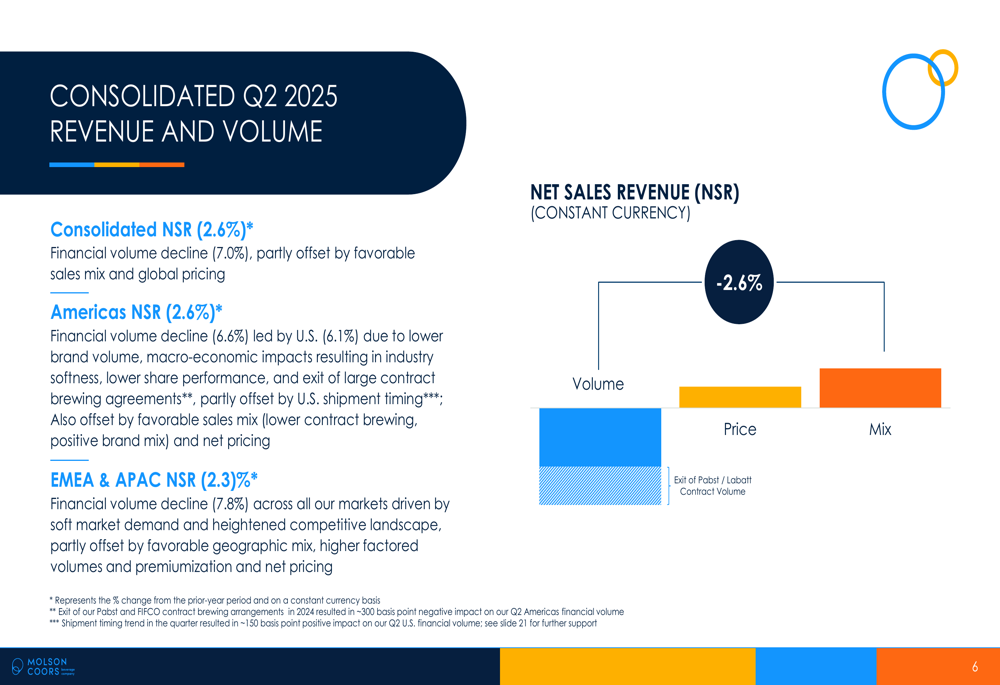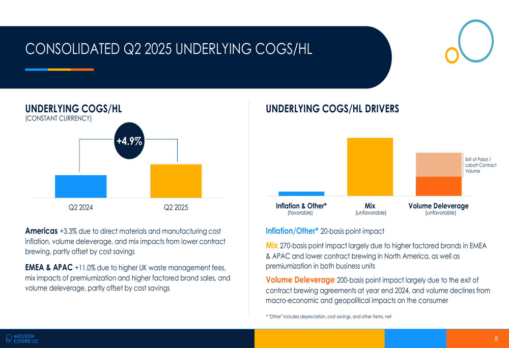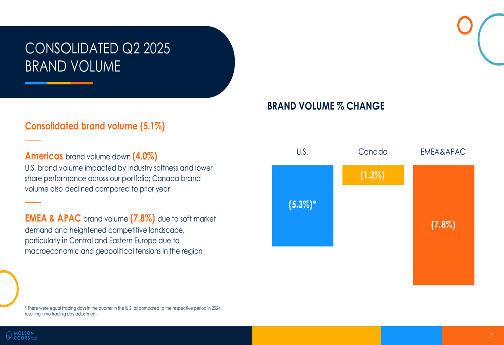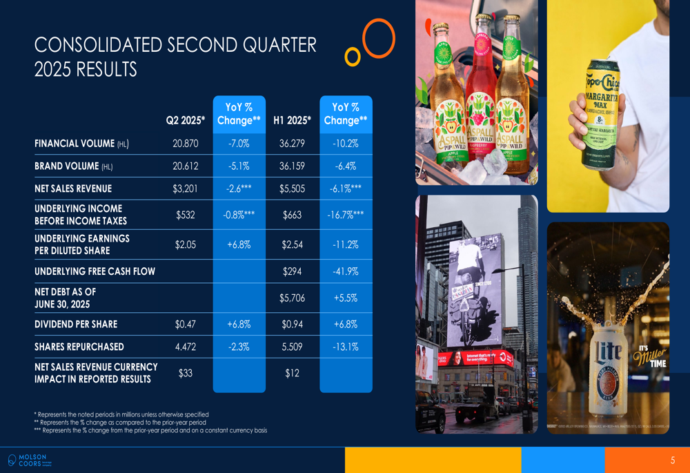 A Molson Coors reportou resultados financeiros mistos para o 2º tri de 2025, com quedas de volume compensadas por preços favoráveis e mix, levando a uma queda menor na receita e renda subjacente relativamente estável.
