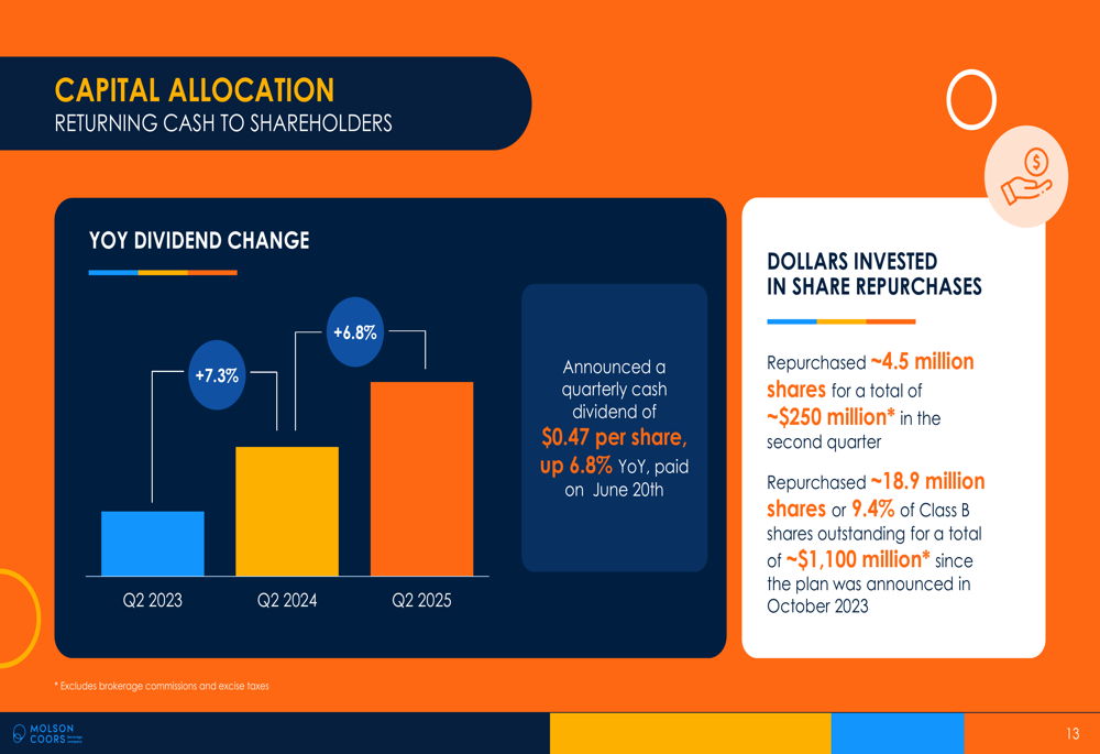 A Molson Coors também continuou seu compromisso de retornar dinheiro aos acionistas, aumentando seu dividendo trimestral em 6,8% ano a ano para US$ 0,47 por ação. A empresa recomprou aproximadamente 4,5 milhões de ações por um total de cerca de US$ 250 milhões no segundo trimestre, totalizando aproximadamente 18,9 milhões de ações (9,4% das ações Classe B em circulação) por cerca de US$ 1,1 bilhão desde que o plano de recompra foi anunciado em outubro de 2023.