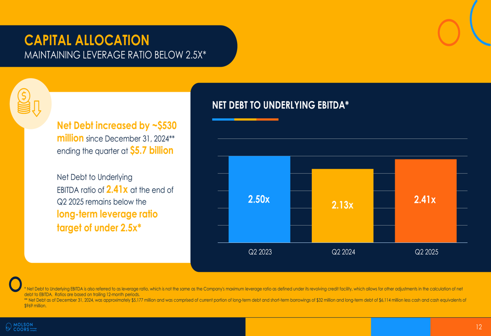 A Molson Coors manteve sua abordagem disciplinada para alocação de capital, equilibrando investimentos no negócio, gestão de dívida e retornos aos acionistas.