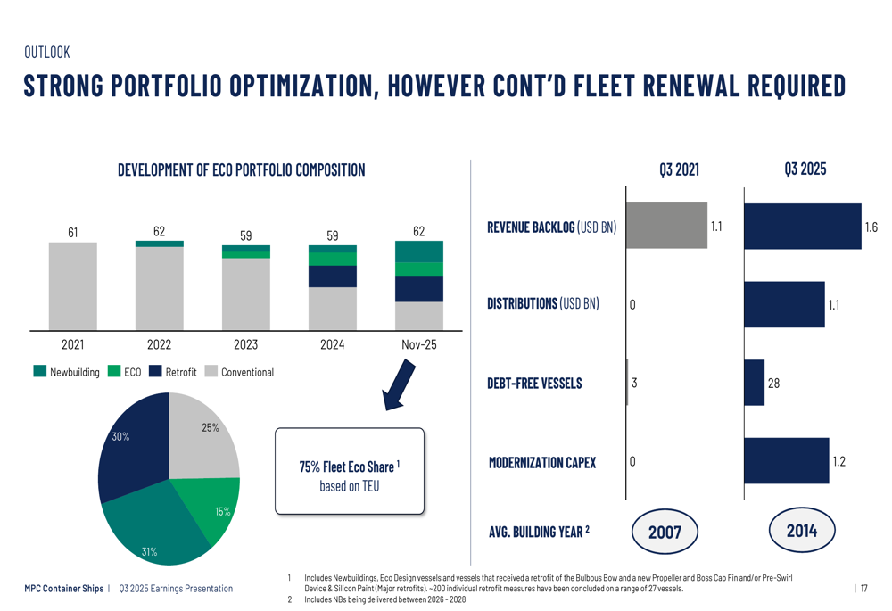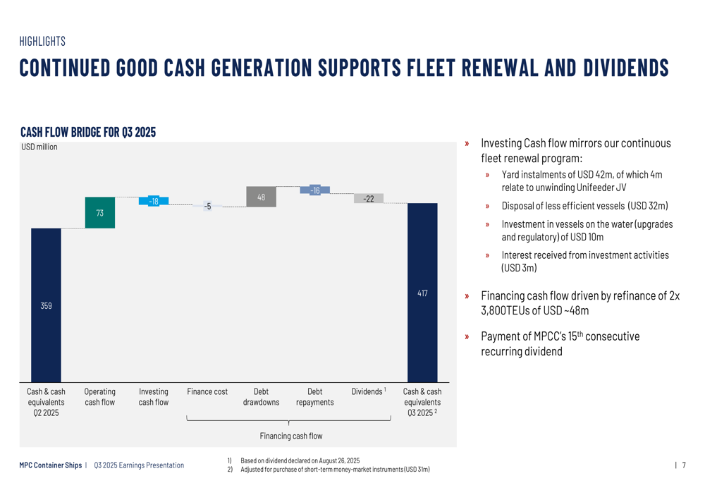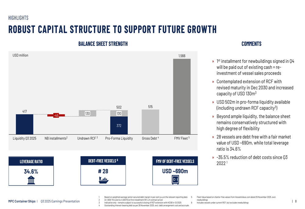 A MPC Container Ships mantém uma estrutura de capital robusta para apoiar suas iniciativas de crescimento. A empresa possui US$ 417 milhões em liquidez no 3º tri de 2025, com 28 navios livres de dívidas avaliados em aproximadamente US$ 690 milhões. O índice de alavancagem está em 34,6%, que a empresa descreve como conservadoramente estruturado com alto grau de flexibilidade.