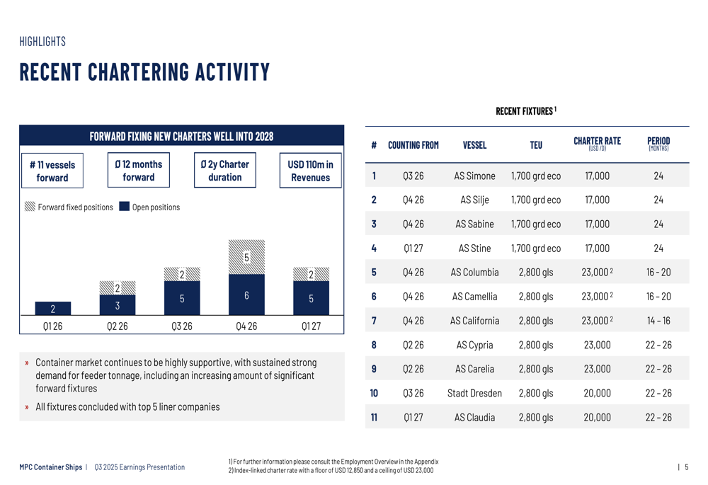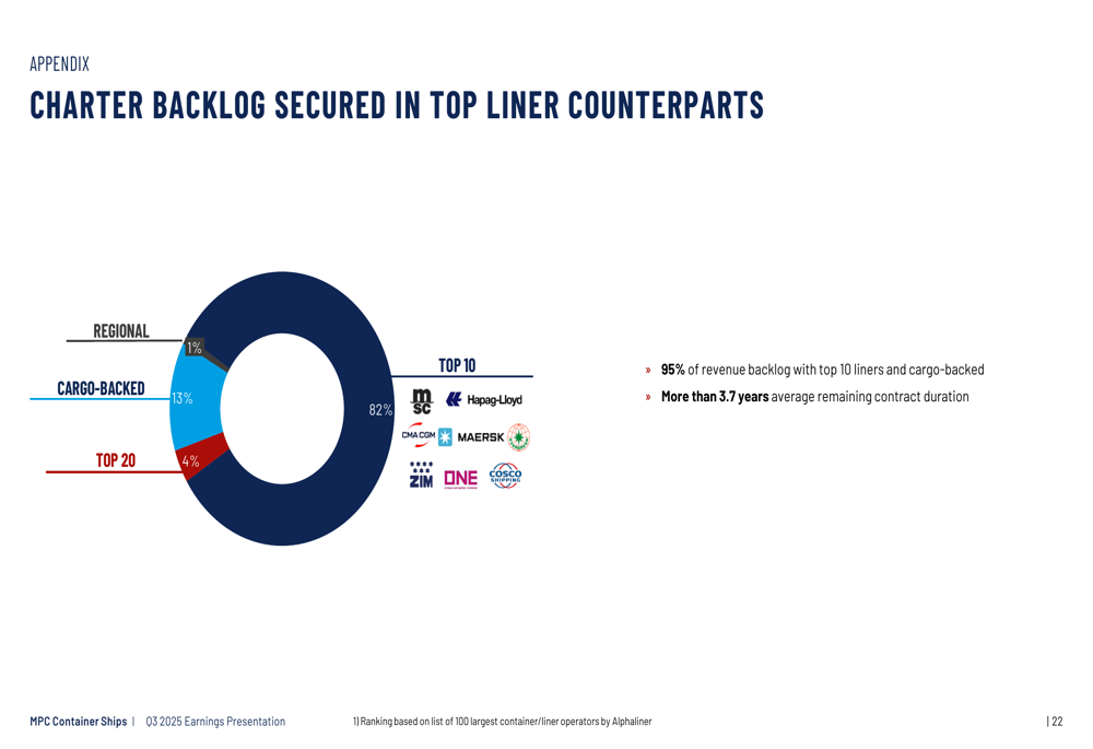 A MPC Container Ships também tem sido ativa na fixação antecipada de navios em contratos de fretamento, adicionando US$ 110 milhões à sua carteira de receitas através de 11 navios fixados em contratos de fretamento de aproximadamente 2 anos com empresas de navegação de primeira linha. Esta atividade recente de fretamento é detalhada abaixo: