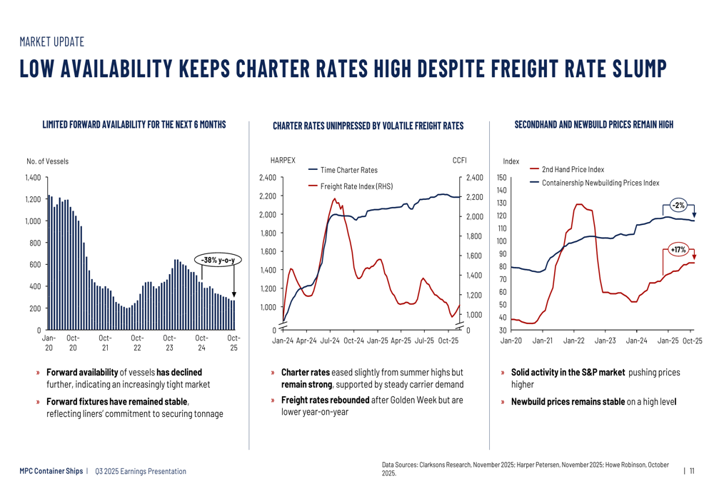 O mercado de transporte de contêineres continua enfrentando incertezas devido a tensões geopolíticas, possíveis mudanças nas políticas comerciais dos EUA e questões sobre a retomada dos trânsitos pelo Mar Vermelho. No entanto, a MPC Container Ships se posicionou para navegar por esses desafios através de alta cobertura contratual e renovação estratégica da frota.