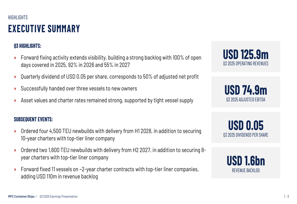 A MPC Container Ships reportou receitas operacionais de US$ 125,9 milhões no 3º tri de 2025, abaixo dos US$ 137,9 milhões do 2º tri de 2025 e dos US$ 132,5 milhões do 3º tri de 2024. O EBITDA ajustado foi de US$ 74,9 milhões, comparado a US$ 80,7 milhões no trimestre anterior e US$ 78,7 milhões no mesmo período do ano passado. A empresa manteve um forte lucro líquido ajustado de US$ 45,0 milhões, embora inferior tanto ao trimestre anterior (US$ 48,6 milhões) quanto ao 3º tri de 2024 (US$ 57,5 milhões).