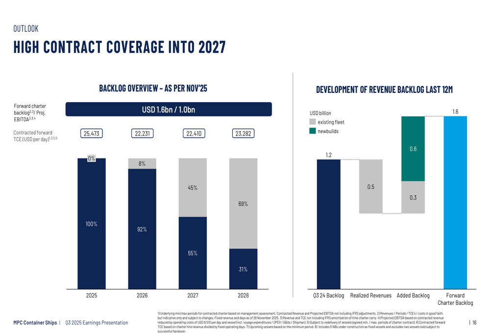 Um ponto forte destacado na apresentação é a alta cobertura contratual da MPC Container Ships que se estende até 2027. A empresa garantiu 100% dos dias disponíveis para 2025, 92% para 2026 e 55% para 2027, criando uma carteira de receitas de US$ 1,6 bilhão. Isso proporciona visibilidade e estabilidade significativas para ganhos futuros.