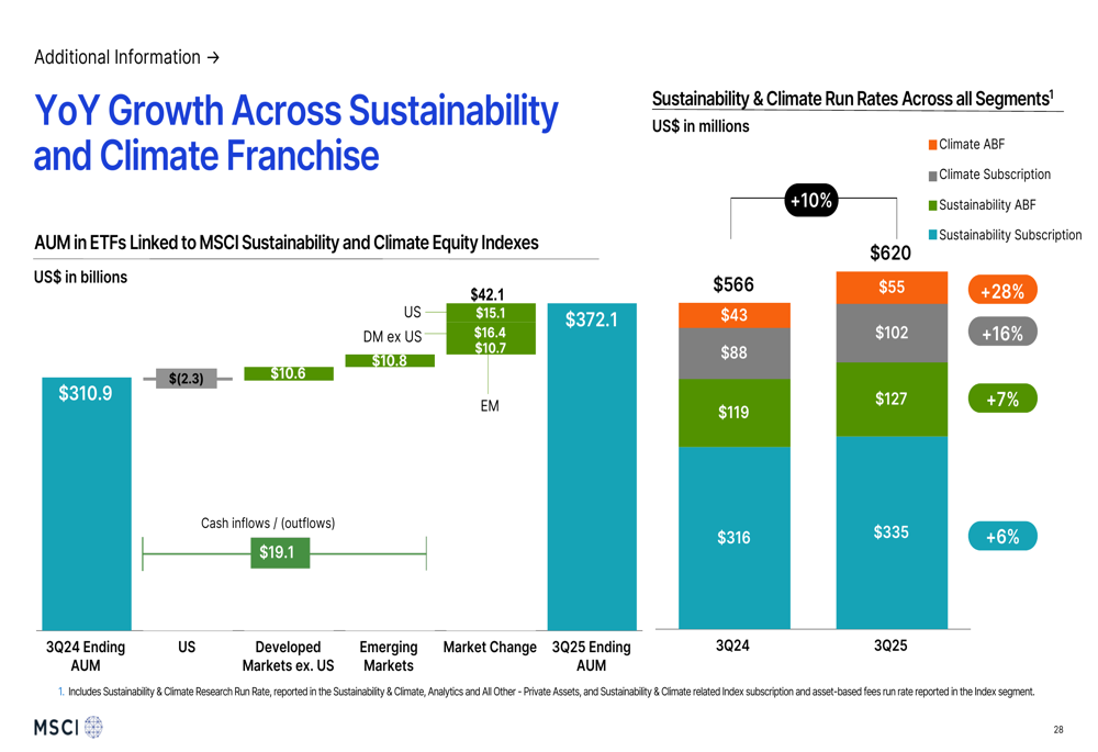 A MSCI continua focada em áreas estratégicas de crescimento, particularmente em análises de sustentabilidade e clima. A empresa relatou crescimento significativo ano a ano em AUM vinculados aos Índices de Ações de Sustentabilidade e Clima da MSCI, bem como aumento nos run rates em toda a sua franquia de sustentabilidade e clima.