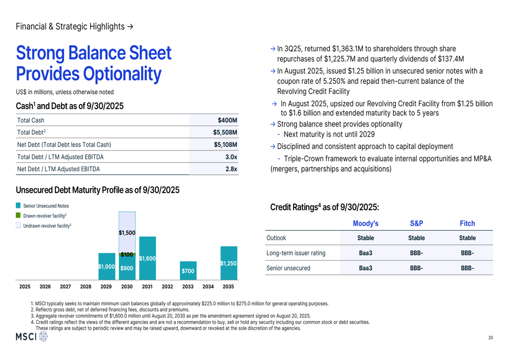 A MSCI manteve um balanço forte, proporcionando flexibilidade para investimentos futuros e retornos aos acionistas. Em 30 de setembro de 2025, a empresa reportou caixa total de US$ 400 milhões e dívida total de US$ 5.508 milhões, com uma relação de dívida líquida para EBITDA ajustado dos últimos doze meses de 2,8x: