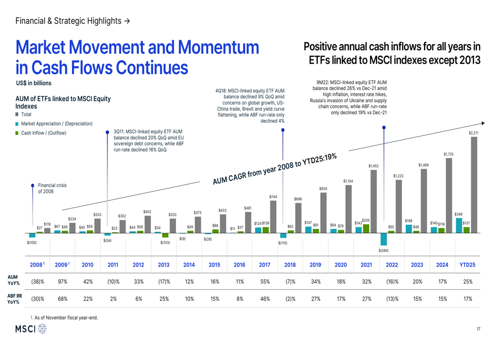 Um fator-chave para o crescimento dos lucros da MSCI tem sido a expansão de seus produtos vinculados a ETFs. O gráfico a seguir mostra o crescimento consistente em AUM de ETFs vinculados aos Índices de Ações da MSCI ao longo do tempo, com uma taxa de crescimento anual composta de 19% de 2008 até 2025: