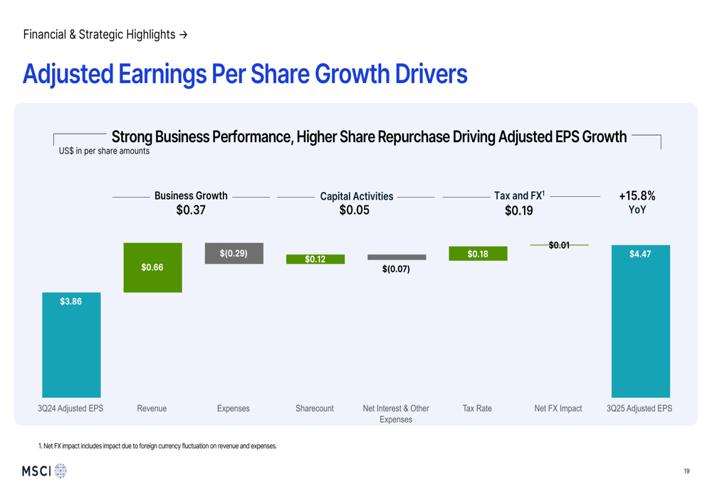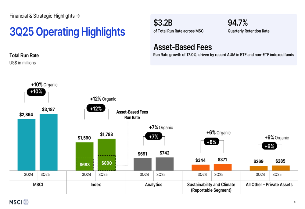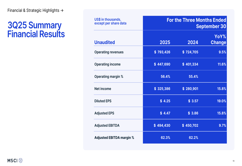 A MSCI reportou resultados financeiros impressionantes para o 3º tri de 2025, com receitas operacionais aumentando 10% em base reportada e 9% organicamente em relação ao ano anterior. A empresa alcançou crescimento significativo no lucro por ação ajustado, que subiu 16% para US$ 4,47, superando as expectativas dos analistas de US$ 4,37.