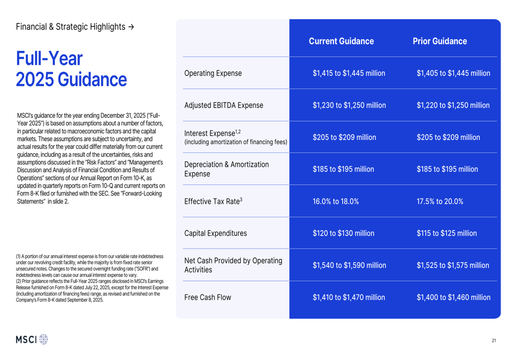A MSCI forneceu orientação atualizada para o ano completo de 2025, ajustando ligeiramente várias métricas em relação à sua orientação anterior: