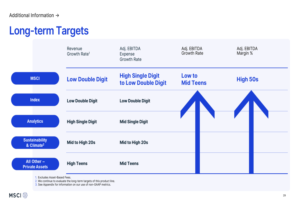 A MSCI também delineou suas metas de longo prazo, visando um crescimento de receita de baixo dois dígitos para a empresa como um todo, com taxas de crescimento variadas em seus segmentos: