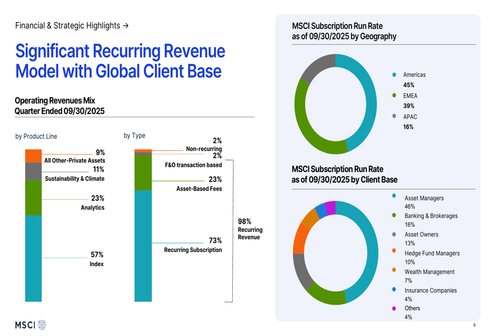 Como ilustrado no gráfico a seguir, a MSCI mantém um modelo significativo de receita recorrente com uma base global de clientes: