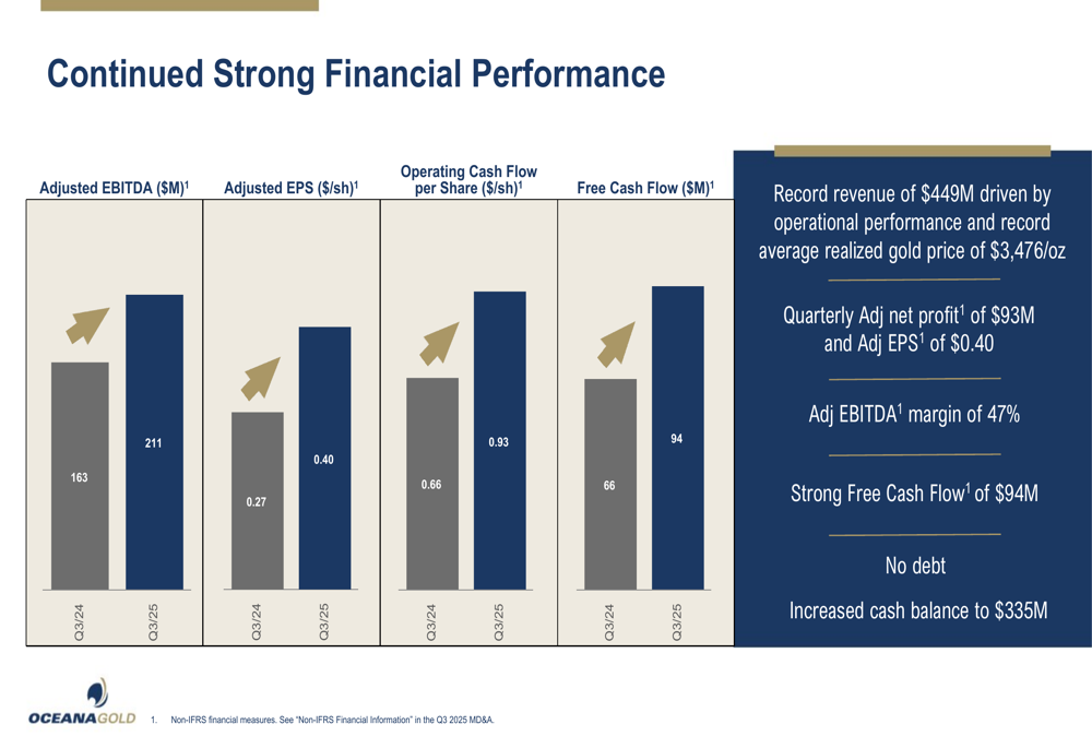O terceiro trimestre da OceanaGold demonstrou melhorias significativas ano a ano em métricas financeiras-chave. O EBITDA ajustado da empresa aumentou para US$ 211 milhões, acima dos US$ 163 milhões no 3º tri de 2024, enquanto o lucro por ação ajustado subiu para US$ 0,40, comparado a US$ 0,27 no mesmo período do ano anterior.