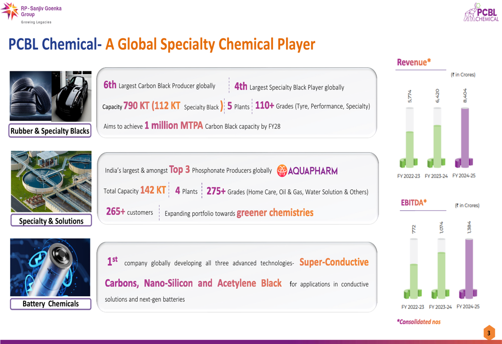 A PCBL Chemical continua a se posicionar como uma empresa de produtos químicos especiais multi-química com ofertas diversificadas em vários setores. A receita da empresa é derivada de pneus e especialidades para pneus (48%), produtos de desempenho (24%), negro especial (11%) e aplicações de petróleo e gás (17%).