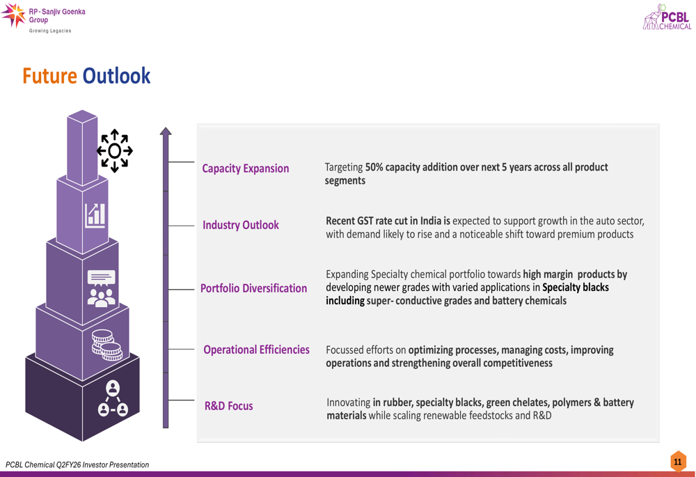 A estratégia de longo prazo da empresa se concentra na expansão da capacidade, diversificação do portfólio para produtos de alta margem e inovação em P&D em borracha, negros especiais, quelatos verdes, polímeros e materiais para baterias. A PCBL Chemical também espera se beneficiar dos recentes cortes nas taxas de GST na Índia, o que deve apoiar o crescimento no setor automotivo.