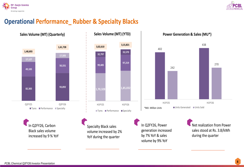 A PCBL Chemical manteve forte desempenho operacional em seu negócio principal de negro de fumo, apesar dos desafios do mercado. A empresa alcançou 99% de utilização da capacidade em suas instalações, com geração de energia aumentando 7% em comparação anual. O ciclo de capital de giro melhorou em 12 dias, liberando aproximadamente Rs. 240 crore em caixa, demonstrando gestão financeira eficaz em meio a condições desafiadoras.