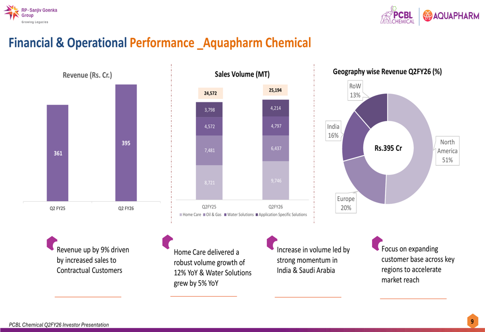 O segmento Aquapharm Chemical mostrou desempenho mais forte, com receita aumentando 9% em comparação anual para Rs. 395 crore no 2º tri do ano fiscal de 2026, impulsionado por maiores vendas para clientes contratuais. O volume de vendas cresceu para 25.194 MT de 24.572 MT no 2º tri do ano fiscal de 2025, com desempenho particularmente forte em produtos para cuidados domésticos (crescimento de 12% em comparação anual) e soluções para água (crescimento de 5% em comparação anual).