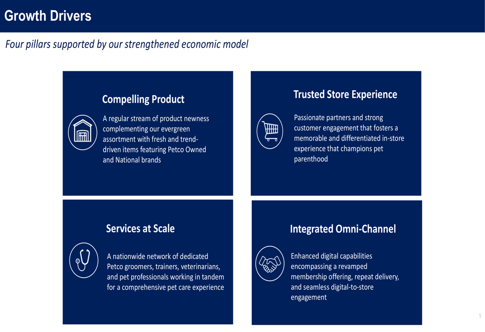 A Petco delineou sua estratégia de transformação em três fases, estando atualmente na segunda fase. A empresa completou a fase um (Fortalecimento dos Fundamentos), que incluiu o fortalecimento dos fundamentos do varejo e a formação da equipe de liderança sênior. Agora está executando a fase dois (Implementação e Execução), focando na excelência de merchandising, experiência aprimorada do cliente e aumento da produtividade das ofertas de serviços, antes de avançar para a fase três (Retorno ao Crescimento).