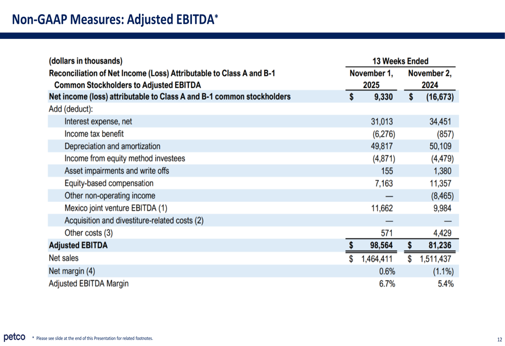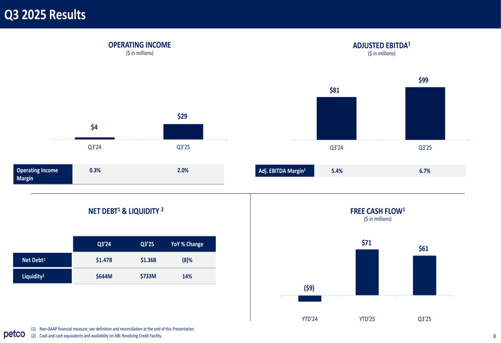 Os resultados do 3º tri de 2025 da Petco mostraram melhoria notável em indicadores-chave de lucratividade. O EBITDA ajustado aumentou para US$ 99 milhões (margem de 6,7%) em comparação com US$ 81 milhões (margem de 5,4%) no 3º tri de 2024, representando uma melhoria de 21% em relação ao ano anterior.